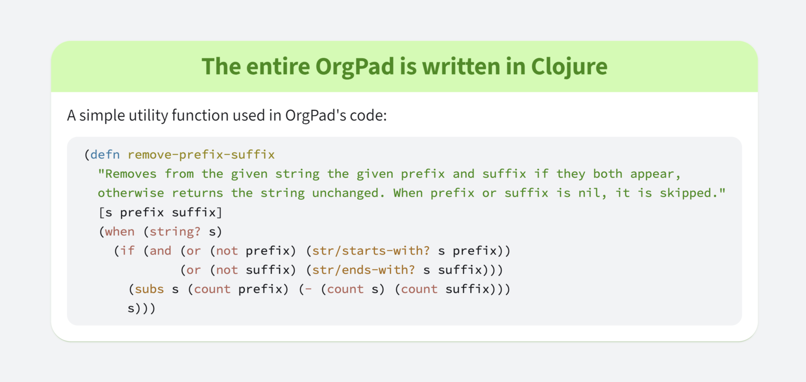 We chose highlighting colors so they are distinct but not distracting. This matches OrgPad’s overall color palette, where no color overpowers the rest. We also tried to make colors consistent across languages—comments are gray, strings are green, and so on. You can see some highlighting examples for different languages here: